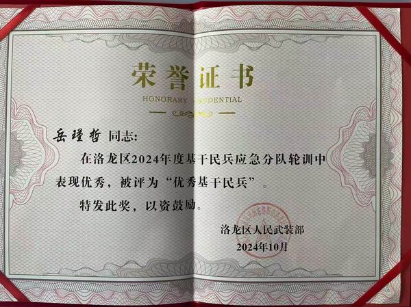 在洛龙区2024年基干民兵轮训备勤总结大会上,集团支部党员岳瑾哲、张亚丹在众多基干民兵脱颖而出,被洛龙区人民武装部授予“优秀基干民兵”称号。